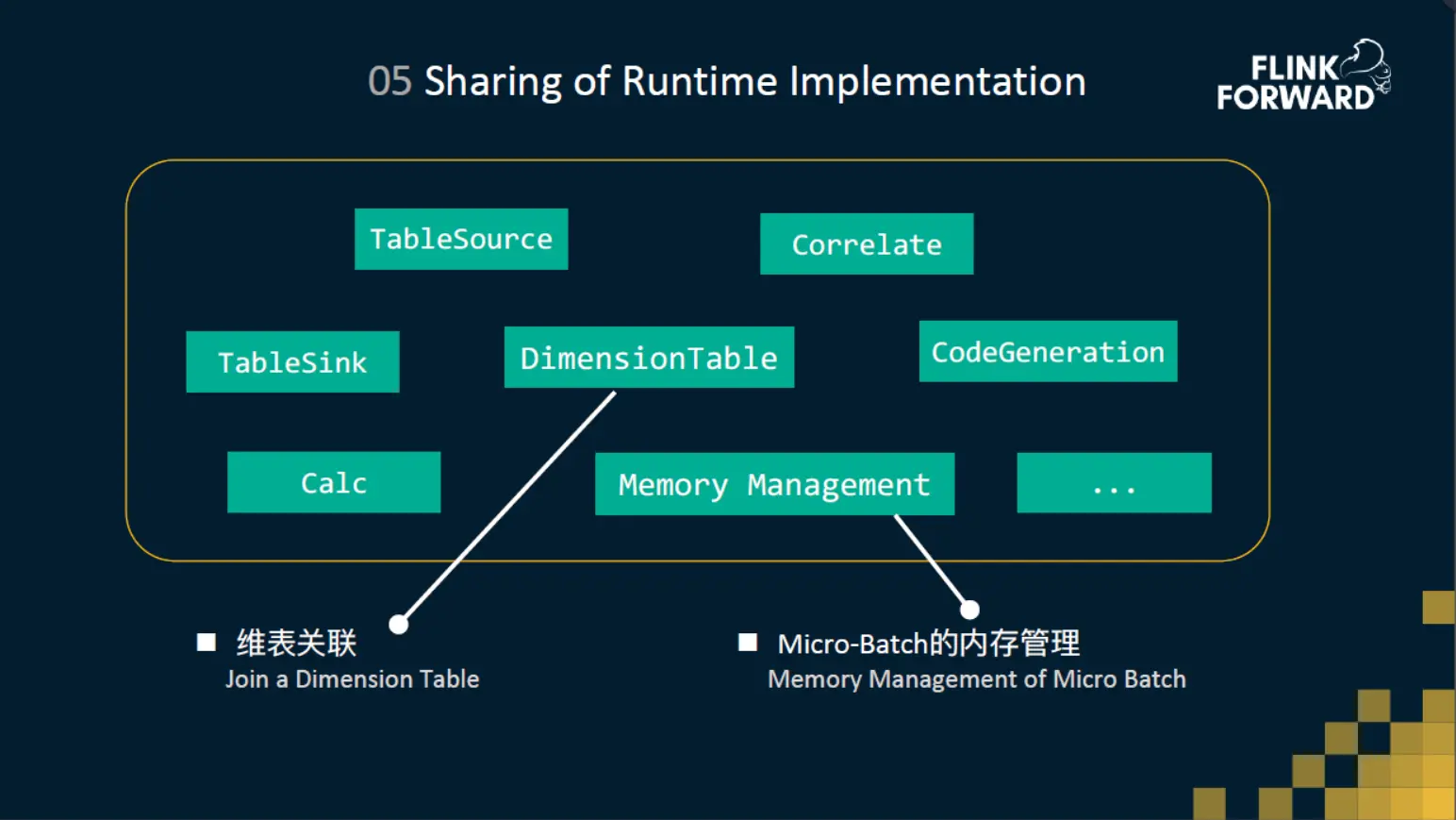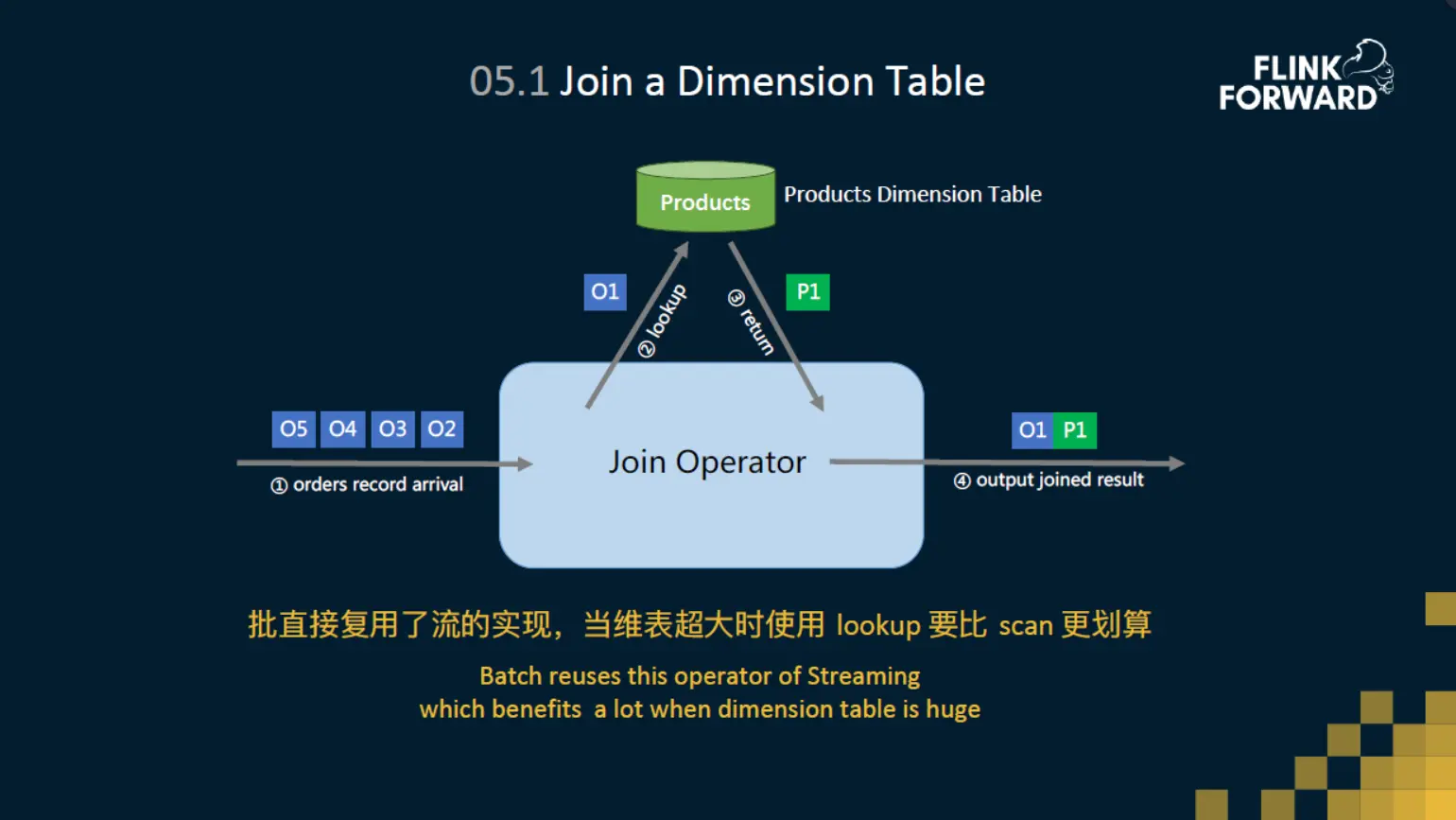 维表关联,大家应该都比较了解,就是一个流要去join一个存在外部的数据库。我们会拿流数据的 ID 去 lookup 维表,这个lookup的过程,我们会实现成同步的模式或者是异步的模式。 我们知道 DataStream 上支持了异步IO接口,但是DataSet是没有的。不过由于我们统一了Operator层,所以说批可以直接复用流的 operator 实现。虽然在传统的批处理中,如果要查询维表,会先把维表scan下来再做 JOIN。但如果说维表特别大,probe端特别小,这样可能是不划算的,使用lookup的方式可能会更高效一些,所以说这也是弥补了批在某些场景的一个短板。