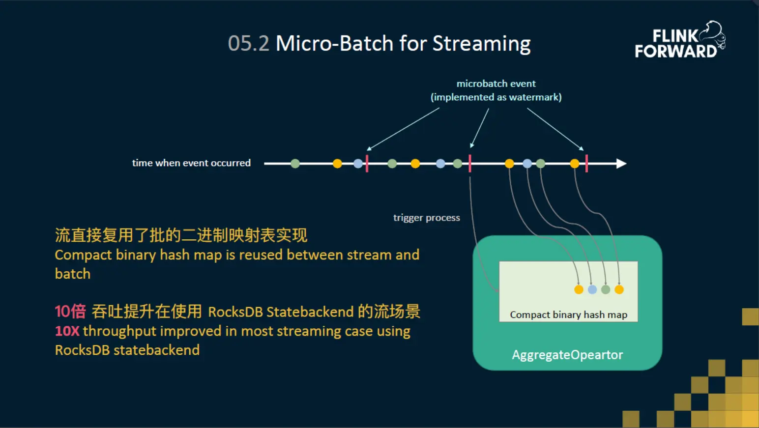 为了避免对state的频繁操作,我们在流上引入了Micro-Batch 机制。实现方式就是在数据流中插入了一些 micro-batch 的事件。然后在Aggregate的Operator里面,收到数据的时候,我们就会把它存到或直接聚合到二进制的哈希表里面(缓存到内存中)。然后当收到 micro-batch 事件的时候,再去触发二进制的映射表(BinaryHashMap),将缓存的结果刷到 state 中,并将输出最终结果。 这里 BinaryHashMap 是完全和批这边复用的。流这边没有去重新造一套,在性能上也得到了十倍的提升。