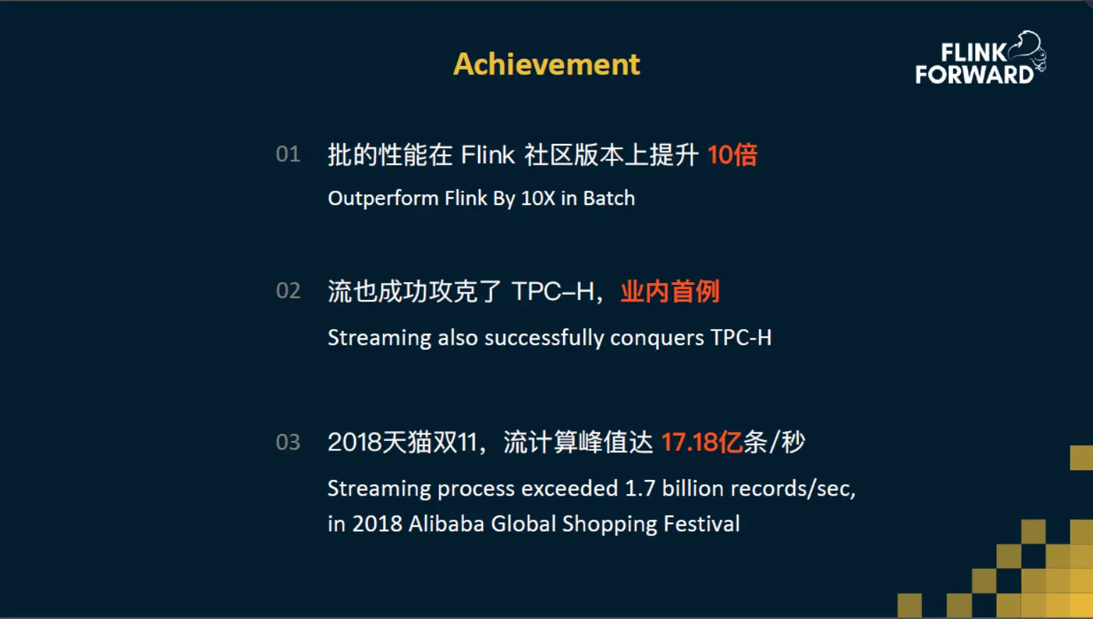 我们先测试了一个批的性能,拿的是TPC-H去做一个测试。我们与Flink1.6.0进行了比较,这个图是在1T的数据量下每个query的一个耗时的对比,所以说耗时越小,它的性能也就越好。可以看出每一个query,Blink都会比Flink1.6 要优秀很多。 平均性能上要比Flink1.6要快十倍。另外借助统一的架构,流也成功的攻克了所有的TBCH的query。值得一提的是,这是目前其他引擎做不到的。还有在今年的天猫双11上流计算,达到了17亿的TPS这么大的一个吞吐量。能达到这么高的性能表现,离不开我们今天聊的统一流批架构。