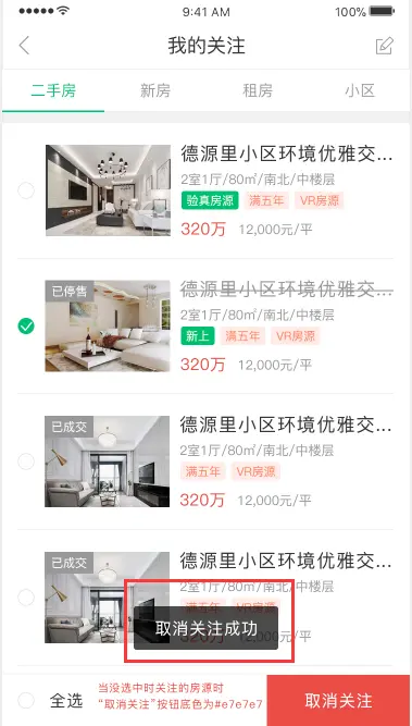 当反馈的信息不重要时,我们可以用自动消失的非模态弹框反馈形式,只要告知用户即可,例如外网的关注房源或取消关注房源时的 Tosat 提示反馈。