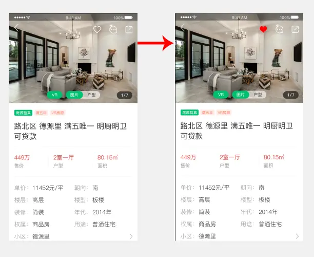 在设计反馈时,如果已经有一组元素的变化足以暗示用户当前状态得到了反馈,那么没必要再增加多余的元素进行反馈提示(除非有特别的目的)。这样会使得用户的心理负担变重,一个反馈可能不足以影响用户体验,如果整个APP都出现这种情况呢,那影响就大了,例如,外网app中的房源详情页关注房源和取消关注的反馈方式仅仅用了图标颜色变化,并没有同时再用toast弹窗就是未来避免过度反馈。