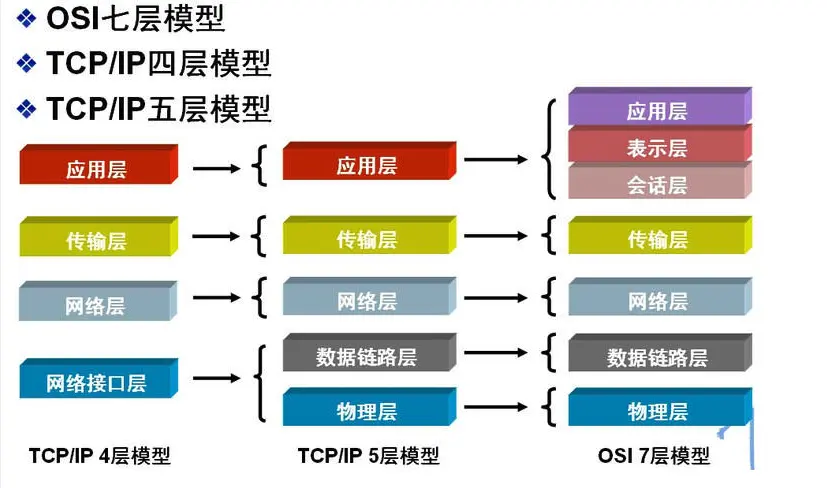常见网络层次划分的方式有三种:OSI七层模型、TCP/IP四层模型、TCP/IP五层模型