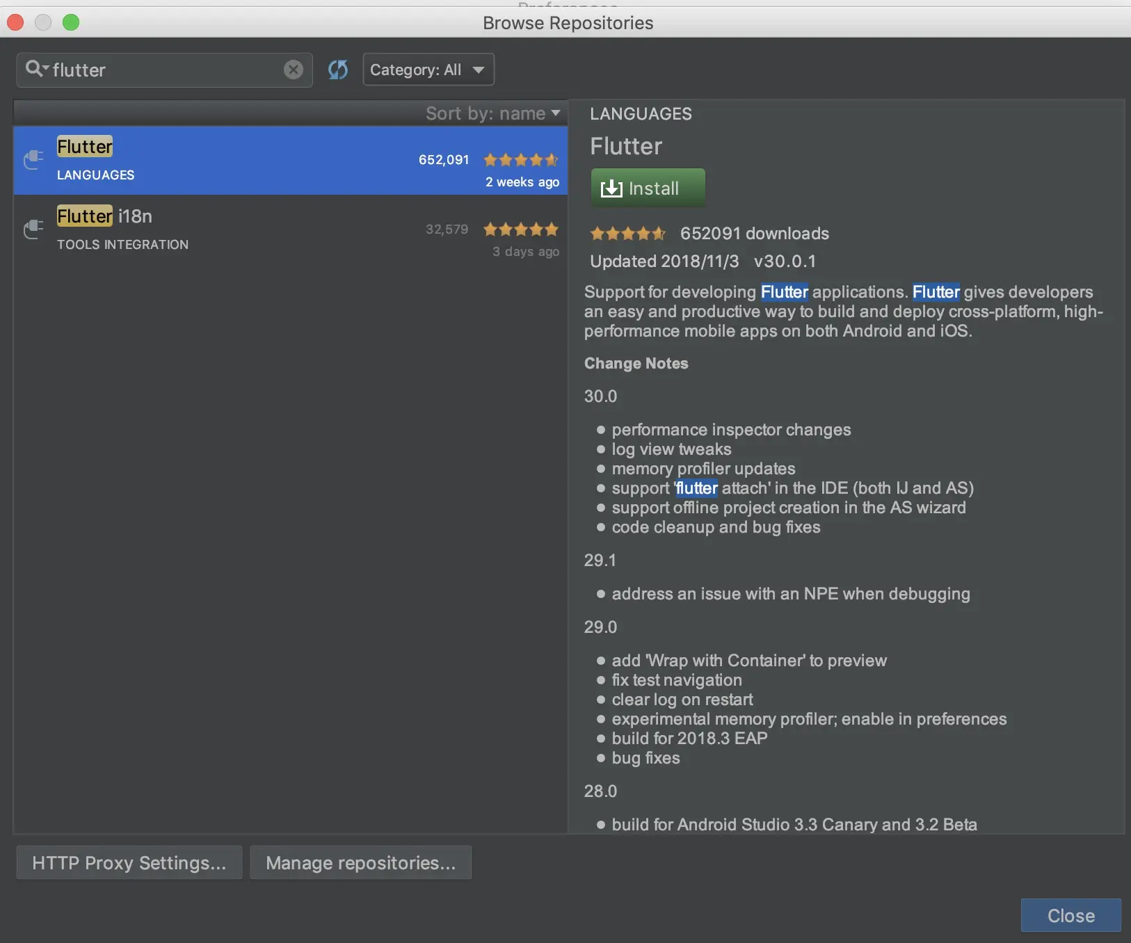 ✗ Flutter plugin not installed; this adds Flutter specific functionality.