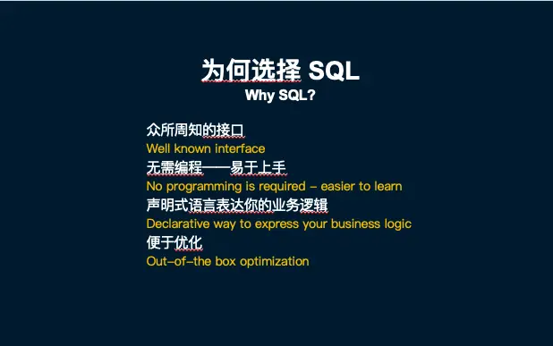 SQL 最大的优势在于普及率高,用户基数大。和其他编程语言相比,它的入门相对简单。作为一类声明式语言,它允许用户只告诉引擎想要做什么,而无需指定如何做。因此即使是小白用户,也可轻松(讲道理有时候也不太轻松)利用 SQL 表达自己所需的逻辑。SQL 优化器会最大限度帮助你提高效率。