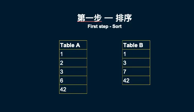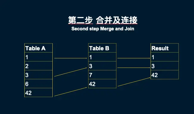 归并连接算法的思路很简单。拿到两表后,我们首先将它们 id 由小到大排好序,然后从前往后同时遍历两表,一旦遇到相等的 id 就输出一条 Join 结果。