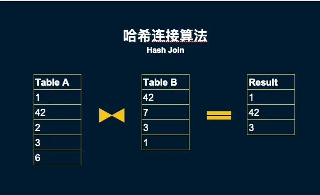 在执行哈希连接算法之前,我们首先要对两表的规模有一个估计,然后选取较小的一张表(示例中的表 B),以 id 值为 key,以数据行为[MOU1] value,建立哈希索引。随后就可以遍历另一侧大表,对每一个 id 值到建立好的哈希索引中查找有没有 id 相等的数据行,如果有则输出 Join 结果。