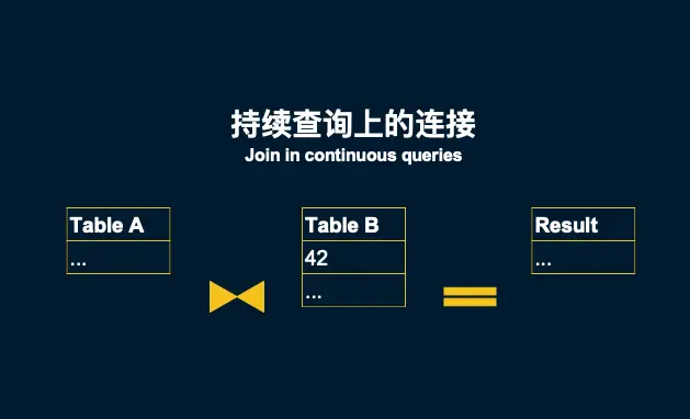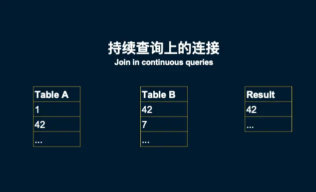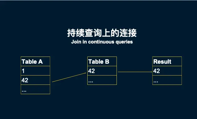 还是以之前的 Join 为例,假设最开始只有表B中有一条数据,由于表 A 为空,这时候显然没有结果输出。随后表A中插入一条数据1,但由于表 B 中没有与之相等的 id,因此依然没有结果。直到表 A 中42到来,才有和表 B 中已有数据相等的 id,并生成相应的 Join 结果。之后表 B 中插入数据7,但不会对结果产生影响。