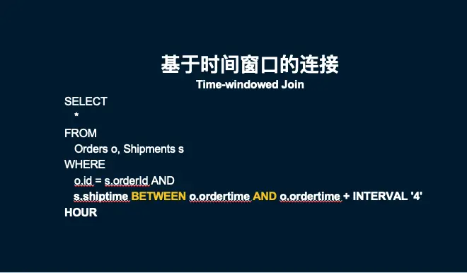 上图是一个简单的时间窗口连接查询示例。和普通 equi-join 相比,它多出来一个查询条件,即限制一侧表的时间需要在另一侧表的时间所定义的一个窗口内(示例查询中,限制运输时间需要在订单记录产生后的4小时内)。有了这个时间窗口条件,就可以帮助我们清理无用的哈希表(状态)。因为对任意一条流中的数据 x ,在另一条流上都有一个满足 Join 条件的时间下限(最迟时间),一旦 Watermark 超过这个时间,就表示另外一条流上后面到来的数据将不会再和 x 产生 Join 结果,此时就可以安全地将 x 从状态中清除。