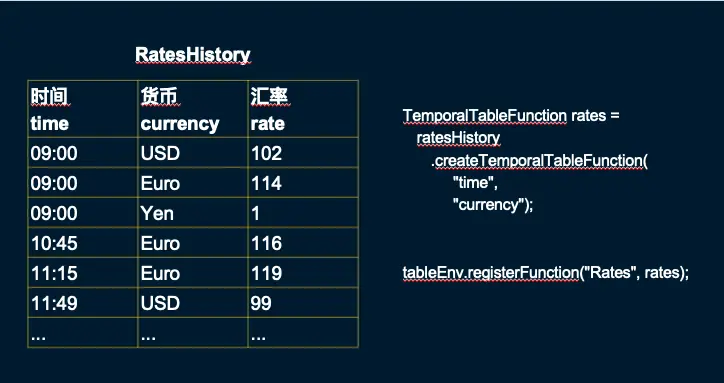 上图展示了一个货币汇率随时间变化的 changelog (不是表本身!),每条记录表示某货币在对应时间点的汇率值。为了在 Flink SQL 中为它注册一个历史表,需要用到 TemporalTableFunction(没错,历史表可以在一定程度上理解为一个 Time-Versioned TableFunction)。具体注册过程如下图所示,其中第一个参数“time”是时间字段,第二个参数“currency”表示主键。