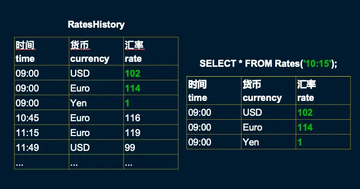 在介绍此类 Join 之前,我们需要理解历史表的概念。它是在 ANSI SQL 2011中新引入的特性,可以简单理解为,对于一个随时间不断变化的表 T ,每给一个时间 t,都会有一个对应该时间(或版本)的表格快照 T(t)。下面我们来看一个示例。