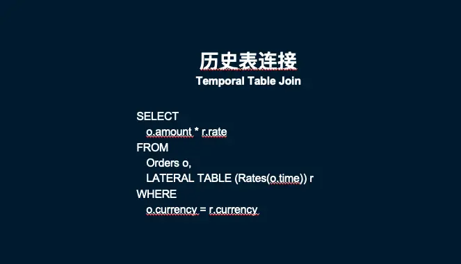 这里除了之前提到的历史表,还引入了一个 LATERAL 关键字,它表示针对订单表中的每一条数据,都需要生成一个新的汇率表。