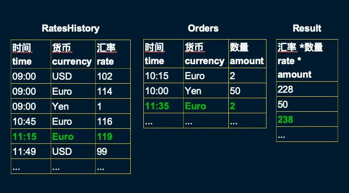 一个很容易想到的操作就是根据汇率,将每个订单的货币量都转化为本地货币的量。由于货币汇率不断变化,我们需要用一些复杂的 Join 条件来完成上述任务,但如果用历史表连接,就变得很直观: