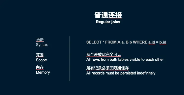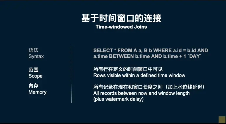 在传统数据库中允许针对一张表进行全表扫描,但在流式场景下却做不到,其原因在于:1、我们无法控制下一条到来的数据属于表 A 还是表 B;2、流数据具有无尽性。既然无法进行全表扫描,传统的归并连接算法和哈希连接算法都无法简单应用。
