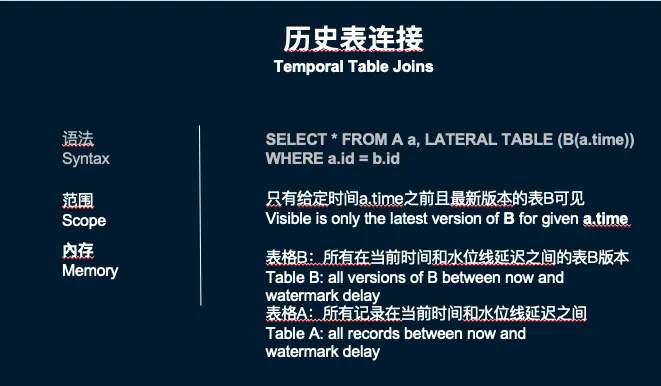 时间窗口连接只适合天然存在窗口条件的场景,因为某条数据一旦过期就会被永久删除,再也无法产生包含它的 Join 结果。为了应对更多场景,Flink SQL 在近期版本新加入了历史表(Temporal Table)和相应的 Join 功能。