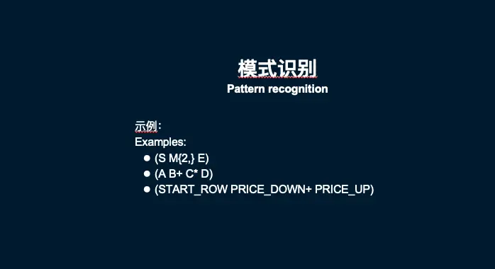 OK,接下来我们再看一看 Flink SQL 近期新加的模式识别功能。这里的模式指的是一些能用正则表达式描述的某些数据特征序列。