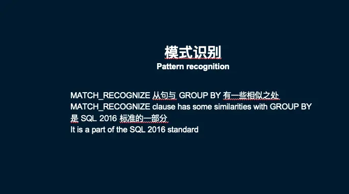 总结一下利用 MATCH_RECOGNIZE 子句进行模式识别的两个点。其一是它和 GROUP BY 子句类似,可以理解为执行一个特殊的聚合;其二是这个子句已经成为 SQL 2016 标准的一部分。