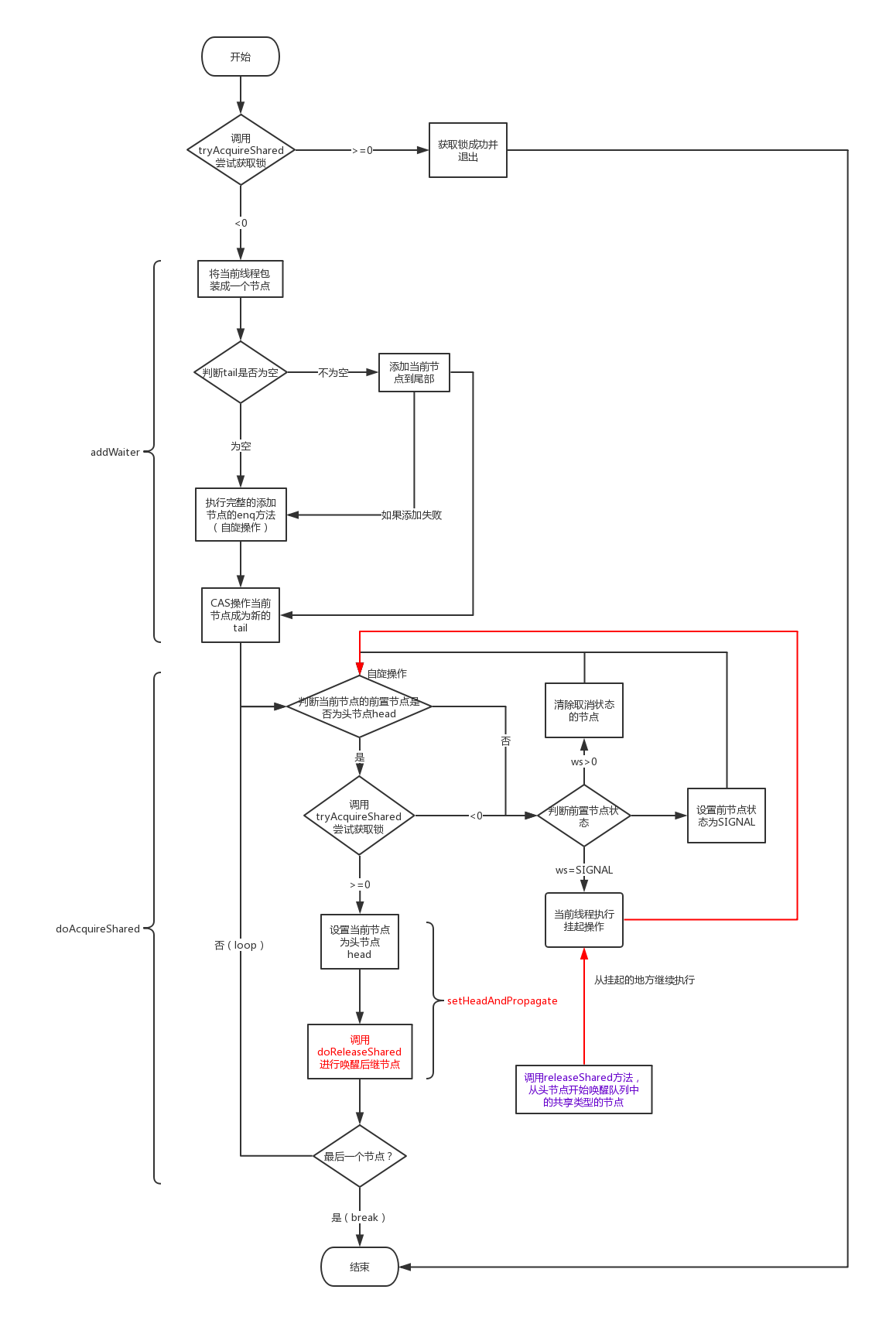 更独占锁相比,从流程图也可看出,共享锁的主要特征是当有一个线程获取到锁之后,那么它就会依次唤醒等待队列中可以跟它共享的节点,当然这些节点也是共享锁类型。