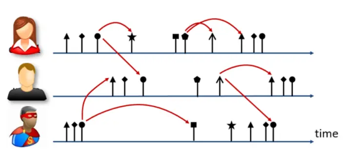图1给出了多维异步事件序列的一个示意图,三个用户的行为被表征为不同的事件序列,不同类型的事件由不同形状箭头表征,红色箭头代表事件间前后关联。