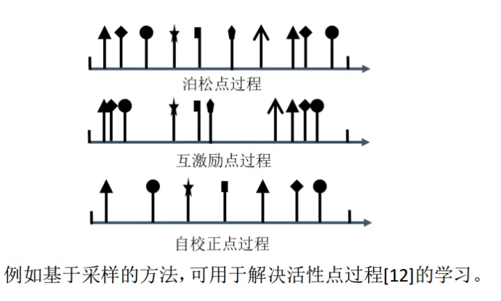 尽管基于时间序列的序列模型已经被现有文献广泛研究,比如马尔科夫链,隐马尔可夫模型,向量自回归模型等等,但是对于解决异步生成的连续时间域事件数据问题,时序点过程成为了一个被有效的解决方法。
