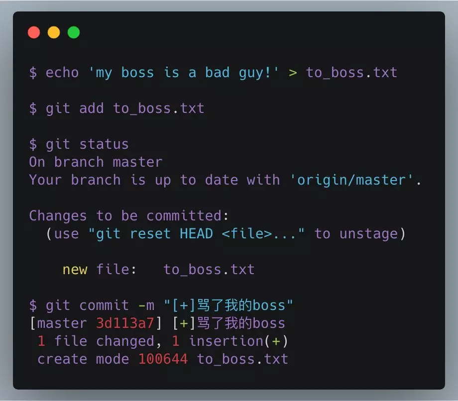 我们来创建一个文件,并附带提交信息[+]骂了我的boss,达到下图的效果