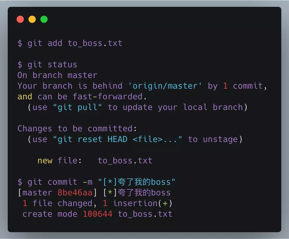 my boss is a bad guy!git add然后status查看新文件已经加入跟踪git commit提交了这次的修改
