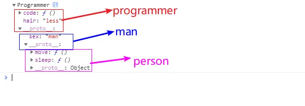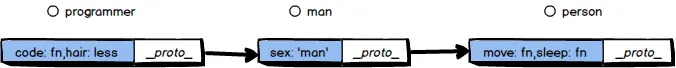 下面举个庸俗的例子,有一个对象人,有move和sleep属性,人中又有男人具有sex属性,男人中又有一类人程序员具有code和hair(其值为less)属性,现在我们想用一个对象来表达程序员,那么这个对象应该同时具备人,男人,程序员的属性,我们用原型链来表达他们,就像这样