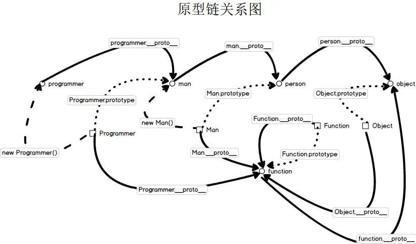 从上面的代码的运行结果中我们不难看出,prototype的作用只是在特定场景下得到的对象的原型(还有其他多种指定对象原型的方式,下面另开小节说明),且这里指定的不仅仅是原型,当指定man为programmer的原型时,同时也意味着man的原型person及person的原型Object这一整个链都被指定给了programmer。