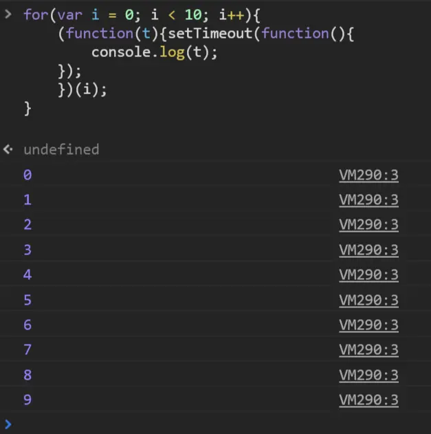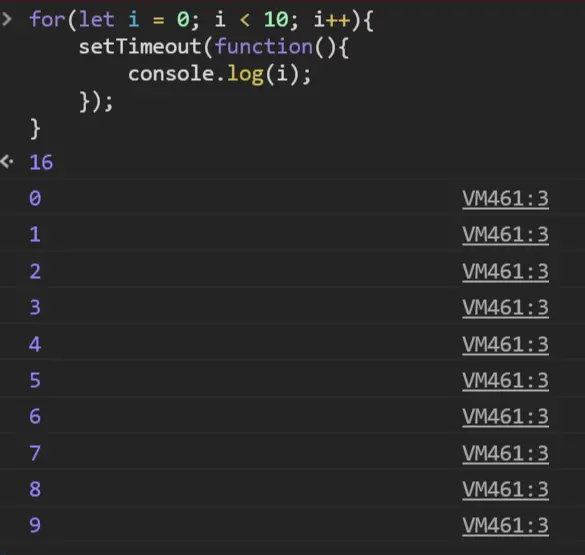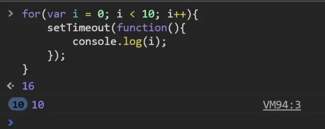 另一个原因是:JavaScript 引擎的事件循环机制在起作用。for循环的同步任务执行完毕之后,才会将从事件队列中取出回调函数,放到调用栈中执行:即setTimeout的回调函数。所以当同步任务执行完之后, i 的值已经变为了 10,此时,10 个定时器的回调开始执行,打印出 10 个 10。