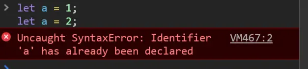 同一个作用域下,let 声明的变量不能和已经声明的变量重名,否则引擎会报错。