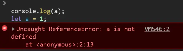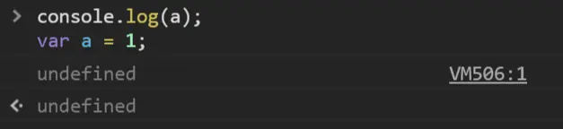 如上代码,a 变量的声明放在了使用之后,我们看下运行结果: