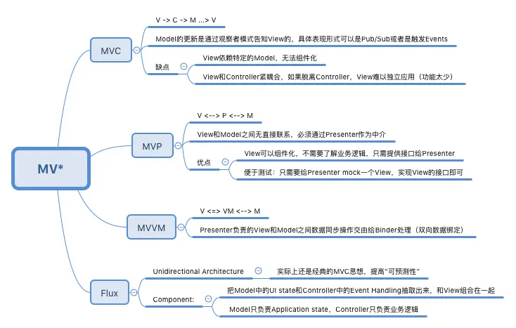 在开始介绍之前,先说一说MV*。大家一定都听说过MVC,在这之后又衍生出了MVP和MVVM,这些都可以统称为MV*。但是,随着前端代码复杂度的增加,人们发现越来越难以管理程序的状态,模块之间耦合严重,代码难以调试,因此很多人认为“前端MVC已死”。