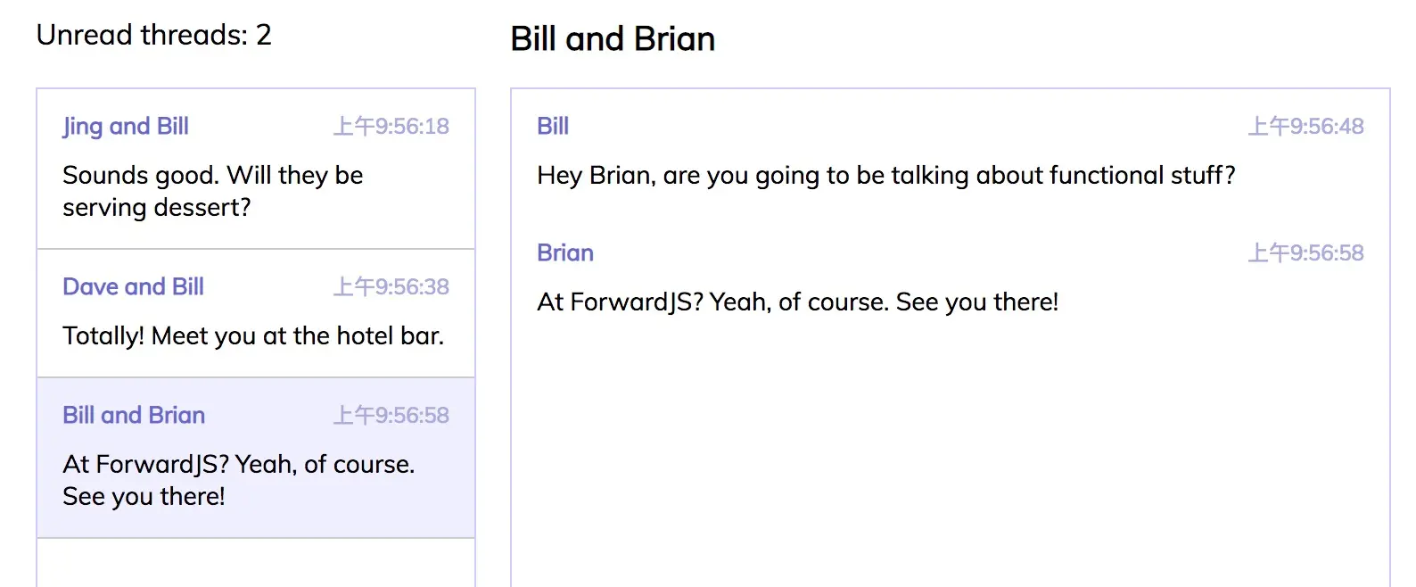 由于Flux采用多Store设计,各个Store之间可能存在数据依赖。以flux-chat为例:在这个聊天软件里,可能会有多个人给你发消息,比如Dave给你发了3条,Brian给你发了2条,当你点开某个人给你发的消息后,界面需要刷新,显示你目前还有几个人的未读消息没有查看: