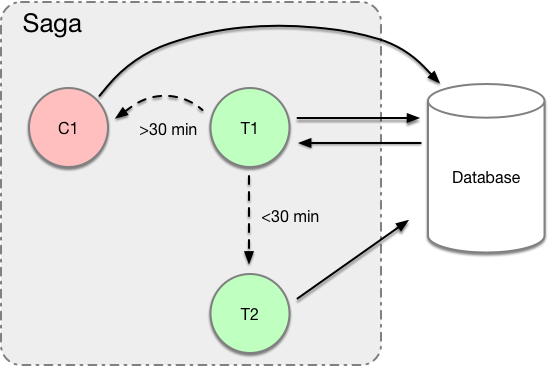 具体是什么意思呢?还是以上面的订票系统为例,两位大佬说了,我们可以把这个LLT拆成两个子事务嘛,T1表示“预定”事务,T2表示“出票”事务。先执行T1,然后就可以把数据库释放出来了,其他人也可以正常订票了。如果用户在30分钟内完成了付款,那么再执行T2完成出票,这样整个事务就执行完毕了。假如超过了30分钟用户还没有付款怎么办?这时候需要执行一个“补偿”事务C1,用来回滚T1对数据库造成的修改。这几个子事务组合在一起,就叫一个saga: