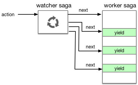 比如我们之前用到的takeEvery()函数,其实内部实现就是不停地take -> fork -> take -> fork …循环。当接收到指定action时,会启动一个worker saga,并驱动其中的yield调用。