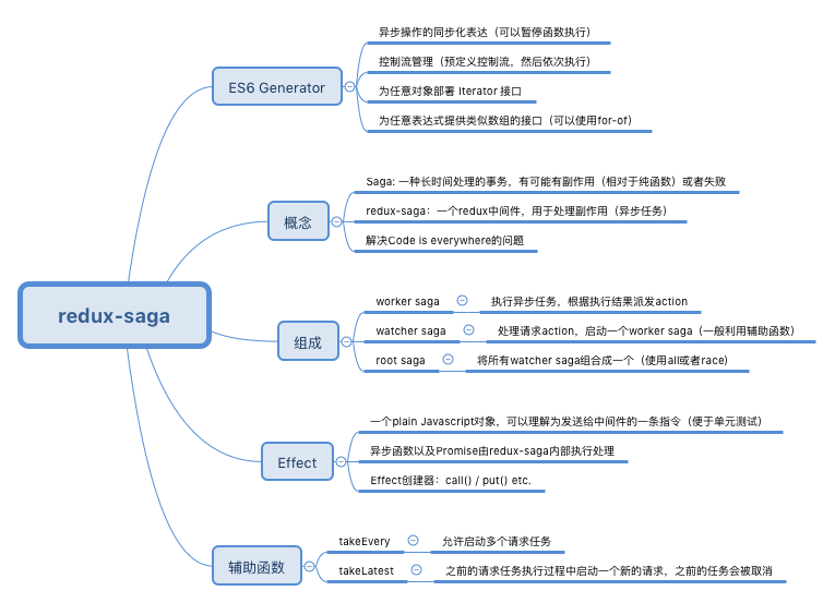 左边的蓝圈圈里就是一堆saga,它们需要和外部进行异步I/O交互,等交互完成后再修改Store中的状态数据。redux-saga就是一个帮你管理这堆saga的管家,那么它跟其他的中间件实现有什么不同呢?它使用了ES6中Generator函数语法。