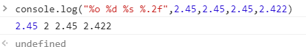 %o 或 %O 打印js对象 %d 或 %i 打印整数 %s 打印字符串 %f 打印浮点数 Chrome不支持精确格式化