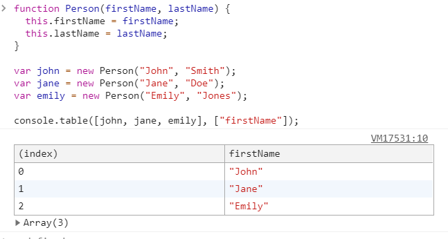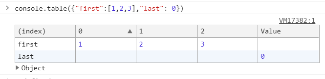 将数据以表格形式显示,数组,对象,类数组对象都可以打印; console.table(data[,columns]);