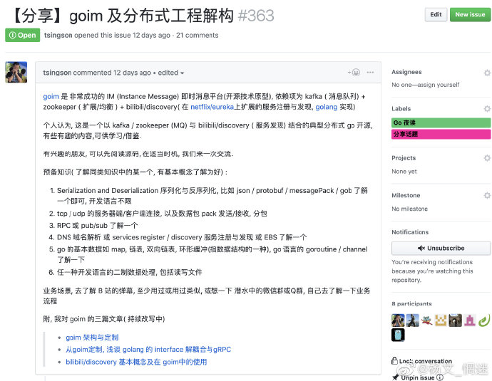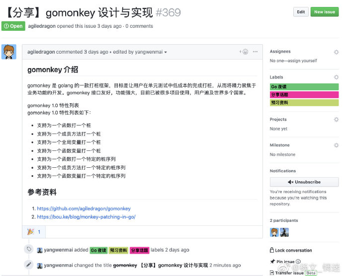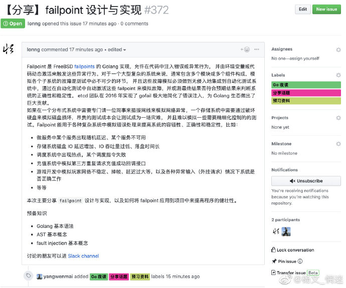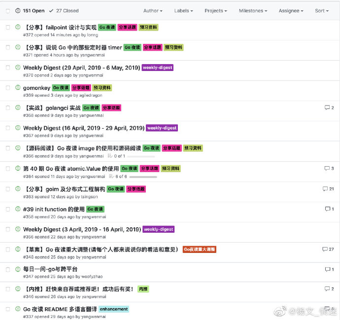 分享的话题都会在 reading-go issues 中开放出来,欢迎大家参与自己感兴趣的,也可以发起你感兴趣的。