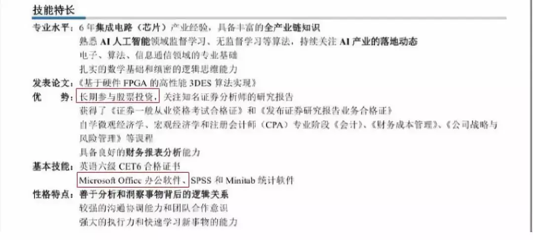 这份简历把office写进基本技能,其实就是在告诉HR你没有其他技能可写了,不仅不会给你的简历加分还会减分。还有这个“长期参与股票投资”也能算是自己的优势?做人还是要低调,我还连续4年都参与了世界五百强的五亿项目呢,我也没写进简历啊!