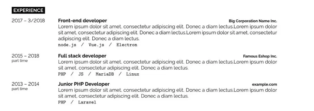 Experience和Project的内容,必须按照时间的倒序进行排列。HR关心的是你最近做了什么事情在哪家公司,不关心你的三五年前做了什么。如果你三五年前的成就比现在还大,那说明你在走下坡路,哪个HR都不会要你的。