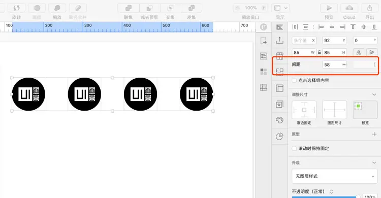 我们经常会遇到多个对象间距调整的问题,一般情况下间距都是统一的,如果遇到间距修改就需要一个个调整。现在在55版本中选中多个元素,右上角的属性面板中会多增加个间距属性,分为水平和垂直。