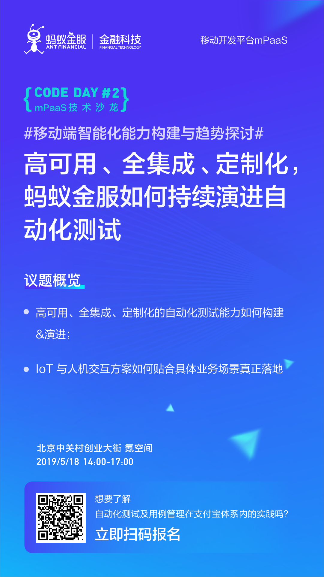 立即扫码报名 5 月 18 日 mPaaS 自办沙龙第二期 CodeDay#2 北京站: