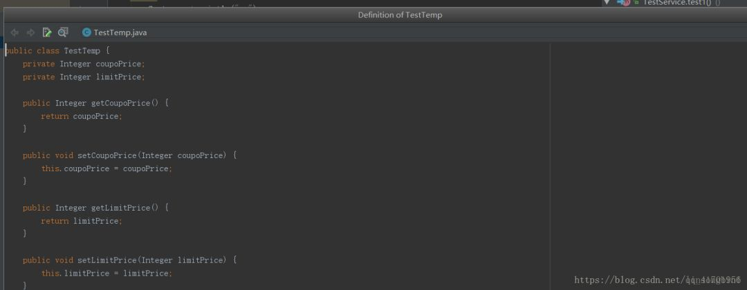 在这个代码块里,你想看看TestTemp类的定义,那么将光标定位在 TestTemp上,然后直接使用ctrl+shift+i,就会弹出如下的窗口。