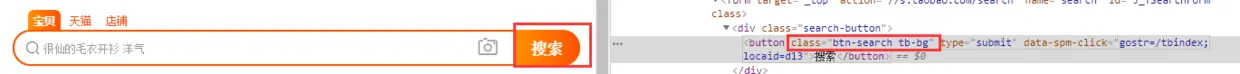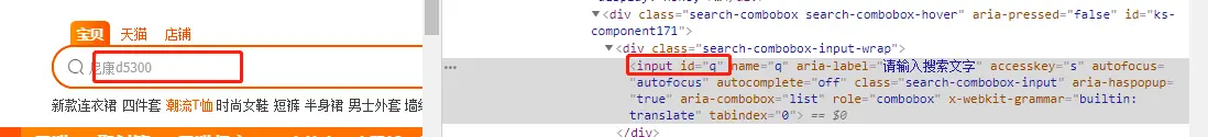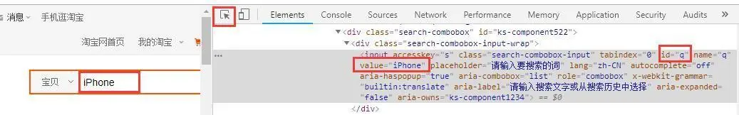 上面程序含义是:在淘宝中搜索“iPad”,那么为什么是find_element_by_id('q')呢?q又是从何而来的呢?我们打开淘宝首页,邮件,审查元素,鼠标点击淘宝的搜索框,如下图所示: