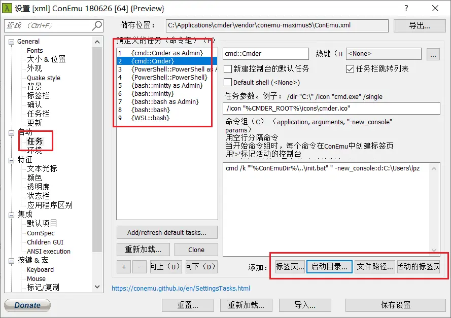 "terminal"配置为自己的 cmder 安装路径。