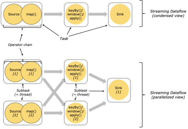分布式计算中,Flink会将算子(operator) 的子task链式组成tasks,每个task由一个线程执行。把算子链化为tasks是一个非常好的优化:它减少了线程之间的通信和缓冲,而且还能增加吞吐量降低延迟。链化操作的配置详情可参考: chaining docs