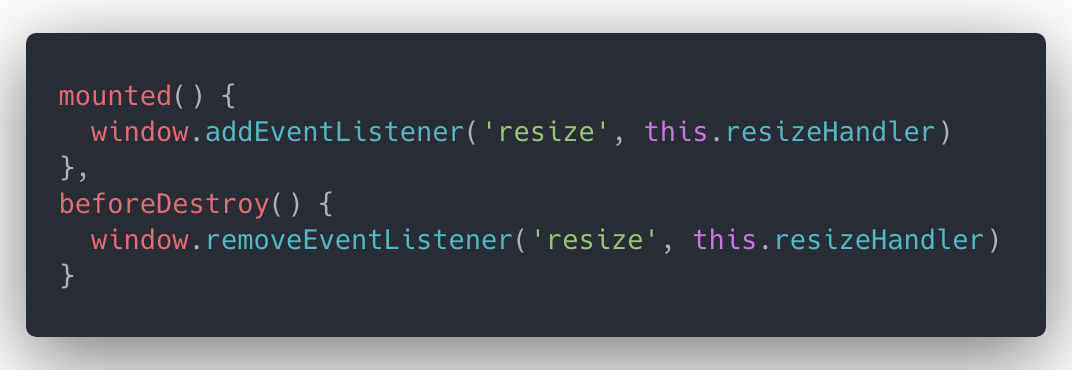 window.addEventListener('resize', this.__resizeHandler),但再声明了之后一定要在beforeDestroy或者destroyed生命周期注销它。window.removeEventListener('resize', this.__resizeHandler)避免造成不必要的消耗。 -