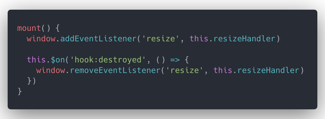 这个是一个文档里没有写的 api,但我觉得是一个很有用的 api。比如我们平时使用一些第三方组件,或者注册一些全局事件的时候,都需要在mounted中声明,在destroyed中销毁。但由于这个是写在两个生命周期内的,很容易忘记,而且大部分在创建阶段声明的内容都会有副作用,如果你在组件摧毁阶段忘记移除的话,会造成内存的泄漏,而且都不太容易发现。如下代码: