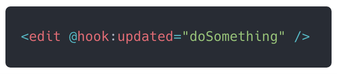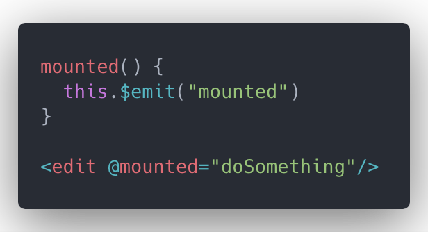 而且我们有了这个 api 之后,能干的事情还不止这个。有时候我们会用一些第三方组件,比如我们有一个编辑器组件(加载比较慢,会有白屏),所以我们在它渲染完成之前需要给它一个占位符,但可能这个组件并没有暴露给我们这个接口,当然我们需要修改这个组件,在它创建的时候手动 emit 一个事件出去,然后在组件上监听它,比如: