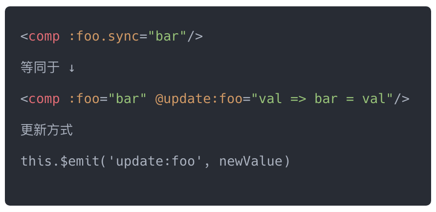 这个也是 vue 2.3 之后新加的一个语法糖。这也是平时在分装组件的时候很好用的一个语法糖,它的实现机制和v-model是一样的。